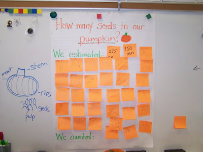 There are so many activities related to pumpkins. For the past few weeks in Science, the children have been learning about this very special seasonal fruit. Oh yes, it is a fruit. We learned that fruits have seeds in them and vegetables do not.This was a big surprise to everyone. Children were invited to scoop out the pumpkin's pulp so that we could estimate the amount of seeds that were in it.